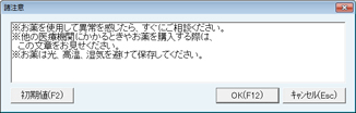 - [初期値(F2)]ボタンで、[5メンテナンス業務]-[1環境設定]-[ユーザー情報]-[服用説明書発行]の「諸注意印字文字列」に登録されてきる内容に戻すことができる。