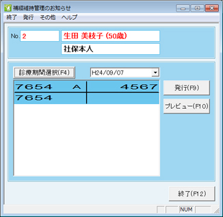 - 表示と異なった期間を選択したい場合は、[診療期間選択(F4)]ボタンをクリック。期間を選び、[終了(F12)]ボタンをクリックする。