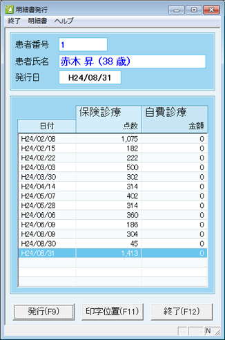 [保険診療][自費診療]に分けて点数が表示されている。対象の日付行を選択し、[発行(F9)]ボタンをクリックする。発行しない場合は、[終了(F12)]ボタンをクリックする。