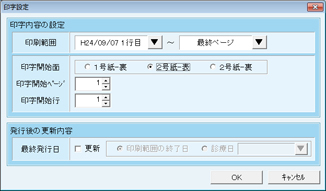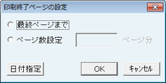 [印刷終了ぺージの設定]画面が表示されるので、印刷末尾を設定する。日付指定で該当する自費診療カルテも探すことができる。終われば[OK]ボタンをクリック。