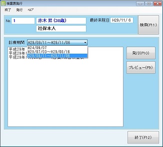 選択された診療期間内で検査表が入力された日付が検査表の種類とともに表示される。印字する日付行をクリックで選択する。日付行は複数選択でき、複数の検査表を比較することで、治療の推移が確認できる。