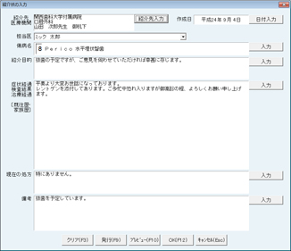 [紹介状の入力]画面が表示される。各項目の[入力]ボタンをクリックし入力画面を呼び出し入力していく。入力画面では、任意の文字入力のほか、登録済みの定型文字列を使い効率的に紹介状文面を作成できる。[定型文字列登録]ボタンをクリックして新たに文字列を登録することもできる。[OK(F12)]ボタンのクリックで[紹介状入力]画面にもどる。