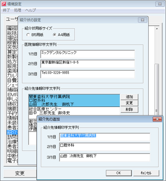 [紹介状の設定]画面で、[紹介先情報印字文字列]に追加して、紹介先を登録する。変更、削除もこの画面でおこなう。