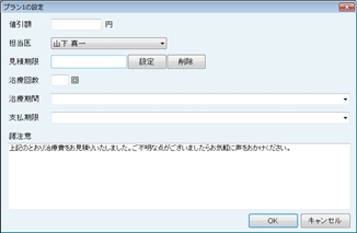 値引額、担当医、見積期限、治療回数、治療期間、支払金額、諸注意を任意で登録する。
