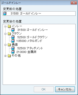 [処置の変更」画面が表示されるので、差し替える自費処置を選択して、[OK]ボタンをクリックする。