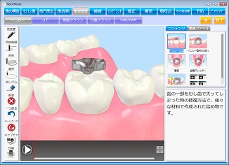 インフォームドコンセントとして、「ナビックムービー/デンタルカルチャー」(株式会社ナルコーム社製)と連動し、患者への治療説明にアニメーションを使用できます。(「ナビックムービー/デンタルカルチャー」の購入については、弊社担当者へご連絡ください。)