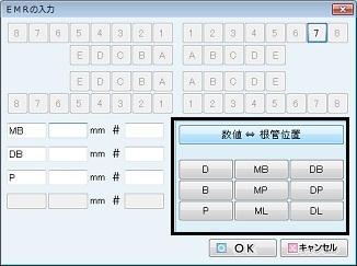 根管位置を変更する場合は、[数値⇔根管位置]ボタンをクリックして根管位置を入力する。