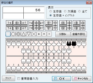 [重複歯番入力]:部位の選択で同一歯番を重複して入力する場合、[重複歯番入力]のチェックボックスをクリックしてチェックをつけてから入力する。チェックが付いている状態で部位を2回クリックすると同一歯番を続けて入力できる(「66」など)。