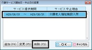 [介護サービス開始日・中止日の変更]画面で削除したい履歴にカーソルをあわせ[削除(F3)]ボタンをクリックすると履歴が削除される。