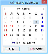 診療日を追加する。過去の診療日のカルテが入力されていなかった場合など、診療日を追加して診療内容を入力する。[診療日]アイコンをクリックするとカレンダーが表示される。追加する日をクリックで選択し、[OK]ボタンをクリックする。[診療内容登録]画面左側の[診療日]欄に日付と担当医の名前が表示される。このあと、[内容入力]等でカルテを入力していく。