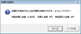 すでに会計処理されている診療日ごと削除する場合、「診療日を削除すると会計情報も削除されます。~」という注意を促すメッセージが表示される。