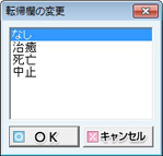 レセプト転帰欄の内容を[なし][治癒][死亡][中止]から選択し設定する。