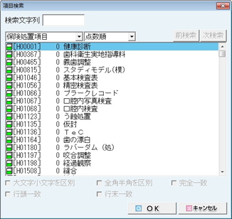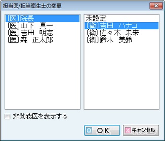 [Dr/DH]アイコンをクリックすると、[担当医/担当衛生士の変更]画面(登録された担当医/担当衛生士のリスト)が表示されるので、変更する担当医または担当衛生士をクリックで選択し、[OK]ボタンをクリックする。選択もしくは入力中の診療日の担当医/担当衛生士が変更される。