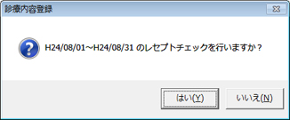 入力された内容が保険請求上、矛盾があるかどうかのチェックをする。[診療内容登録]画面で[レセプトチェック]アイコンをクリックすると、その患者の1診療期間について、「~レセプトチェックを行いますか?」と確認のメッセージが表示されるので、[はい(Y)][いいえ(N)]ボタンをクリックする。