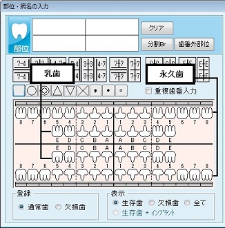 永久歯/乳歯の入力:歯のイラスト内側2列が乳歯、外側2列が永久歯。歯番を選択するときは、各部位の歯のイラストをクリックする。