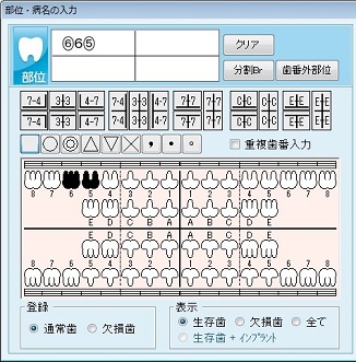 [登録]欄:部位の歯番を入力する前に[通常歯][欠損歯]をクリックして選択する。選択した部位登録モードになり、歯番を選択できる。欠損歯がある場合、[登録]欄で[欠損歯]をクリックして切り替えてから欠損部位を選択する。[通常歯]に切り替えると生存歯のみの表示になる。