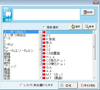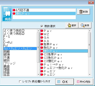 右側より病名をクリックして選択し、[選択]ボタンをクリックする。またはダブルクリックする。