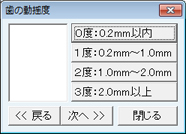 [歯の動揺度]欄をダブルクリックすると[歯の動揺度]画面が表示されるので、ボタンをクリックして検査結果の入力をする。入力の終了は[閉じる]ボタンをクリックする。
