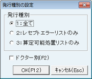 [F7 発行]ボタンをクリックでエラーリストを印刷することができ、必要に応じてリストを印刷する。印刷は、発行種別[1:全て][2:レセプトエラーリストのみ][3:算定可能処置リストのみ]の中から選択。