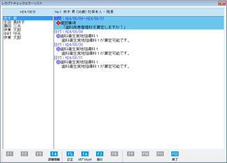 [レセプトチェックエラーリスト]画面が表示され、患者リストおよびチェック内容が右欄に表示される。赤丸は入力内容に問題有り、青二重丸は入力漏れなどの注意情報。