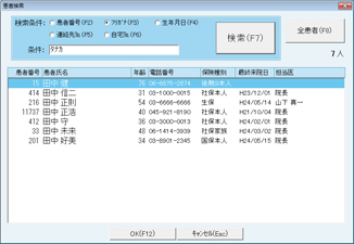 月遅れのレセプトや返戻分のレセプトを追加する場合、[F8 患者追加]ボタンをクリックする。[患者検索]画面が表示されるので、対象患者検索後、選択し[OK(F12)]ボタンをクリック。