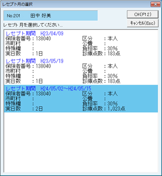 選択した患者の[レセプト月の選択]画面が表示されるので、レセプト月を選択し、[OK(F12)]ボタンをクリック。