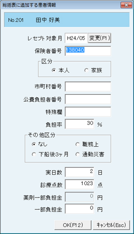 [総括表に追加する患者情報]画面が表示されるので、[レセプト対象月]、[保険証情報]、[実日数]、[診療点数]、[一部負担金]等の確認と修正をおこない、[OK(F12)]ボタンをクリック。