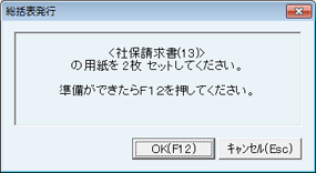 「○○○○の用紙を○枚 セットしてください。」と表示されるので、プリンタに該当する用紙をセットし、[OK(F12)]ボタンをクリックで印刷開始。