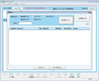 うらメニュー[F5 患者追加]ボタンをクリック。[患者検索]画面が表示されるので患者を選択し、[OK(F12)]ボタンをクリック。[月遅れ請求患者]リストに追加される。