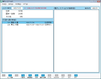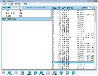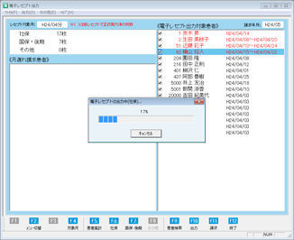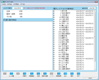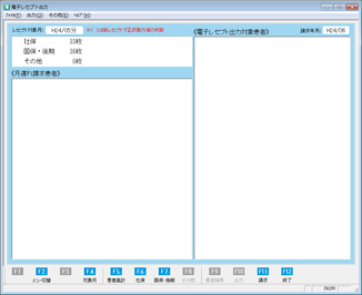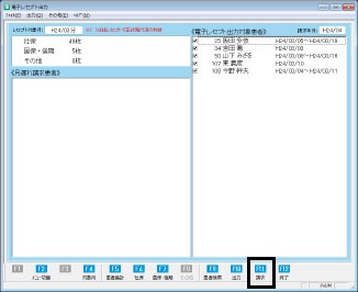 [F6 社保]、[F7 国保・後期]ボタンのいずれかで、それぞれの集計結果による請求対象患者を画面右の[電子レセプト出力対象患者]欄に表示させる。