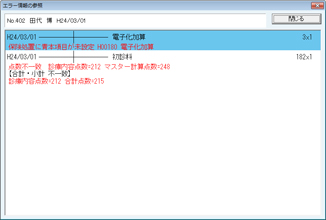 エラー患者は、赤字で表示されるので、該当患者を選択し、[エラー参照]ボタンをクリックでエラー内容を確認する。