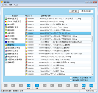 メインメニュー[マスター管理業務]⇒[項目登録]画面の[薬価項目]より服用情報登録する項目にカーソルを合わせ、[F5 変更]ボタンをクリックする。