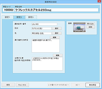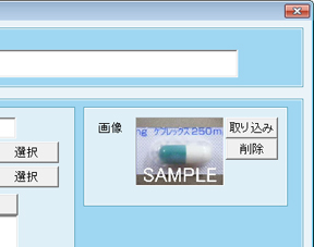 左タブの[設定2]をクリックすると、右側に画像欄が表示される。[取り込み]ボタンをクリックすると画像ファイルの選択画面が表示されるので、あらかじめ用意しておいた薬の写真画像を選択し、[開く]ボタンをクリック。