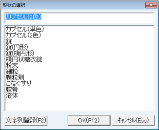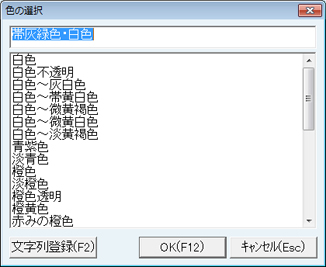 [形状]と[色]は、それぞれ[選択]ボタンをクリックすることで表示される選択画面のリストより選ぶこともできる。また画面上部の空白欄に入力された文字を[文字列登録(F2)]ボタンでリストに登録することができる。