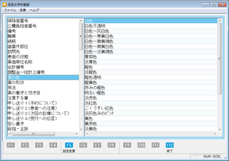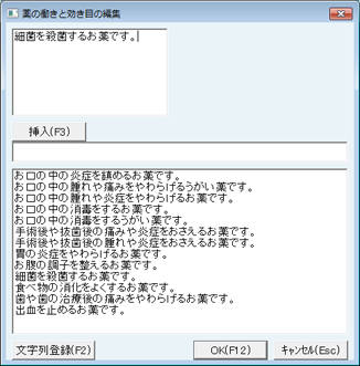 [薬の働きと効き目]と[注意する事]は[編集]ボタンをクリックすることで表示される選択画面のリストより選ぶこともでき、空白欄に入力された文字を[文字列登録(F2)]ボタンをクリックすることでリストに登録することができる。また、リストより選択もしくは空白欄に入力した文字列は、[挿入(F3)]ボタンで画面上部入力エリアの現在あるカーソル位置の後に挿入される。