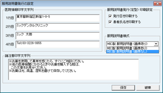 「医院情報印字文字列」欄に服用説明書に印字する医院情報を入力する。