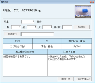 あらかじめ服用方法が設定されている薬品項目・合剤項目を選択した場合、この画面は開かない。