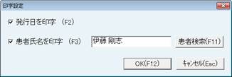 [患者検索(F11)]ボタンをクリックで登録されている患者氏名を検索、入力できる。チェックを付け、氏名を入力しない場合は氏名が印字される場所が空欄となる。