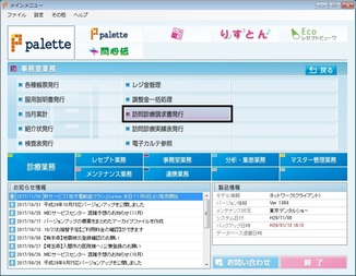「チェックイン」が終わったことを確認してから、院内のクライアント機から請求書発行をおこなう。paletteの[メインメニュー]⇒[事務室業務]を選択。[訪問診療請求書発行]メニューをクリックする。