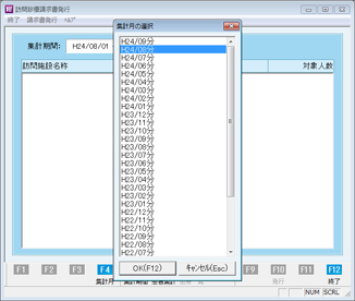 [訪問診療請求書発行]画面が表示されるので、まず[F4 集計月]ボタンで、請求を集計する月を選択する[集計月の選択]画面を出す。集計月を選択し、[OK]。上覧の[集計期間]欄に選択した集計期間が表示されるので、確認する。