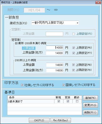 負担率一割で負担金を計算。院外処方せんを出した場合、出さない場合の上限金額の設定ができる。