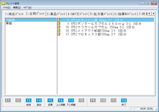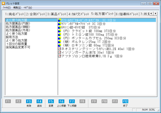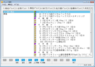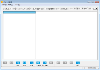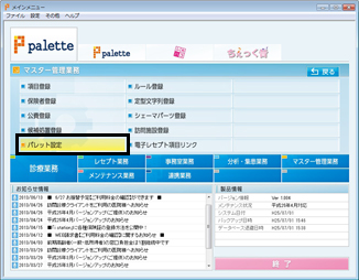 [マスター管理業務]メニューで[パレット設定]をクリック。[パレット設定]画面が開く。上部タブで[病名パレット][合剤パレット][薬品パレット][カルテ文入力パレット][処方箋パレット]が選択可能。