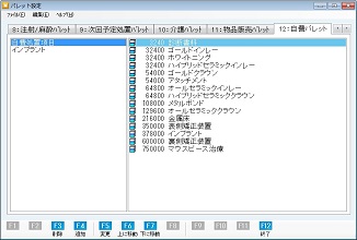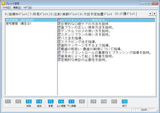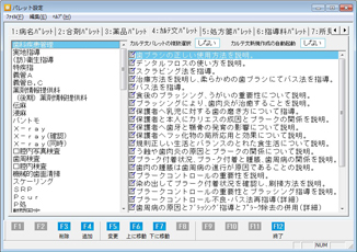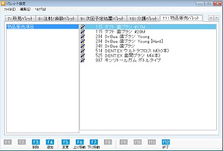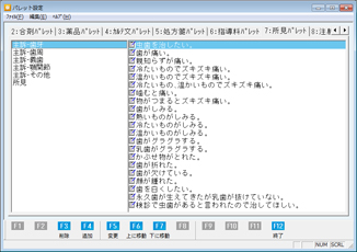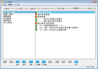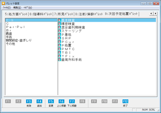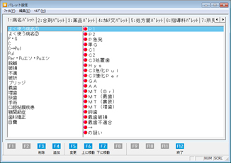 paletteには、入力作業をサポートするパレットが用意されています。このパレットは診療内容を入力する際の病名入力、合剤入力、薬品入力、処方箋入力に利用されます。パレットの内容を新規作成したり、変更・削除・順序の移動することができます。