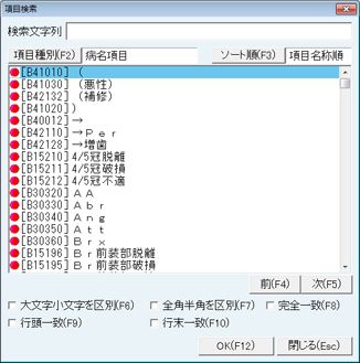 F11[検索]ボタンをクリックで[項目検索]画面が表示されるので、検索文字列を入力して[前(F4)]、[次(F5)]ボタンをクリックで検索。