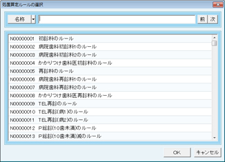 [処置算定ルールの選択]画面が表示される。画面左上の[名称]ボタンをクリックすると[番号]に変わるので、先ほど控えた番号(Nを除く8桁の数字)を入力し、[次]ボタンをクリックする。