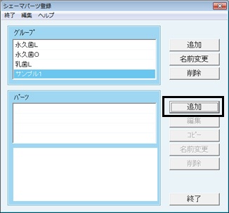 [パーツ]欄の右の[追加]ボタンをクリック。