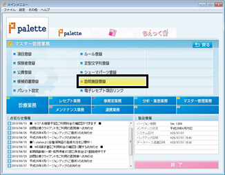 院内のクライアント機から《palette》を起動する。[メインメニュー]から[マスター管理業務]を選択。[訪問施設登録]をクリックする。