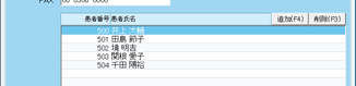 下欄の患者リスト上部の[追加(F4)]をクリック。[患者検索]画面が出るので、検索条件を選ぶか、[全患者]ボタンから患者リストを呼び出す。