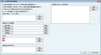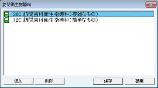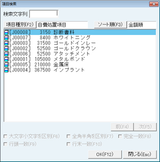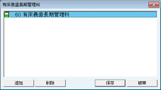 [算定後回数の確認をおこなう処置群]欄に設定された処置は、算定時に算定回数を問い合わせるメッセージが表示される。歯数などで算定回数を判別つけにくい処置などに利用する。処置の追加は[追加]ボタンをクリックし、表示される[項目検索]画面で検索し、追加する。処置を削除する場合は、削除する処置をクリックして選択し、[削除]ボタンをクリックする。