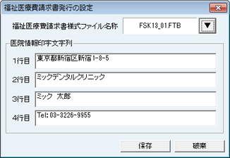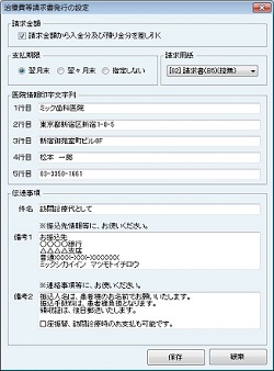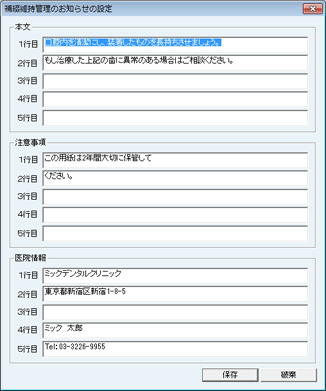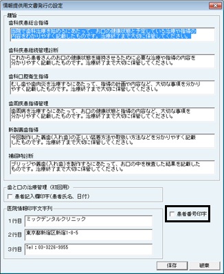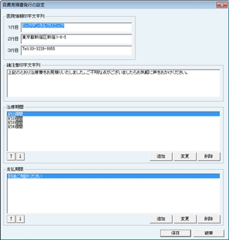[医療情報印字文字列]の各行には医院情報の設定で入力したものが反映されている。変更する場合は、各行に直接入力する。